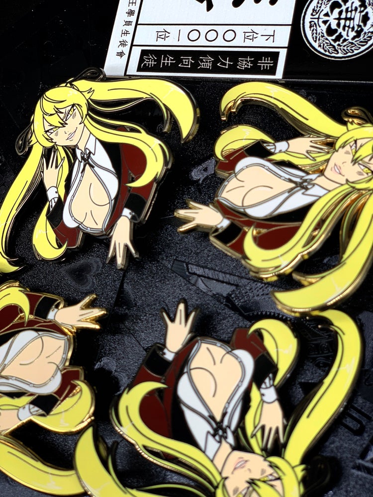 She is not the same size as the original gambling waifu pin, she is 3 in wide, and 2.5 high. We are remaking these at the same height as the original eta will be (3-4 months) from now.